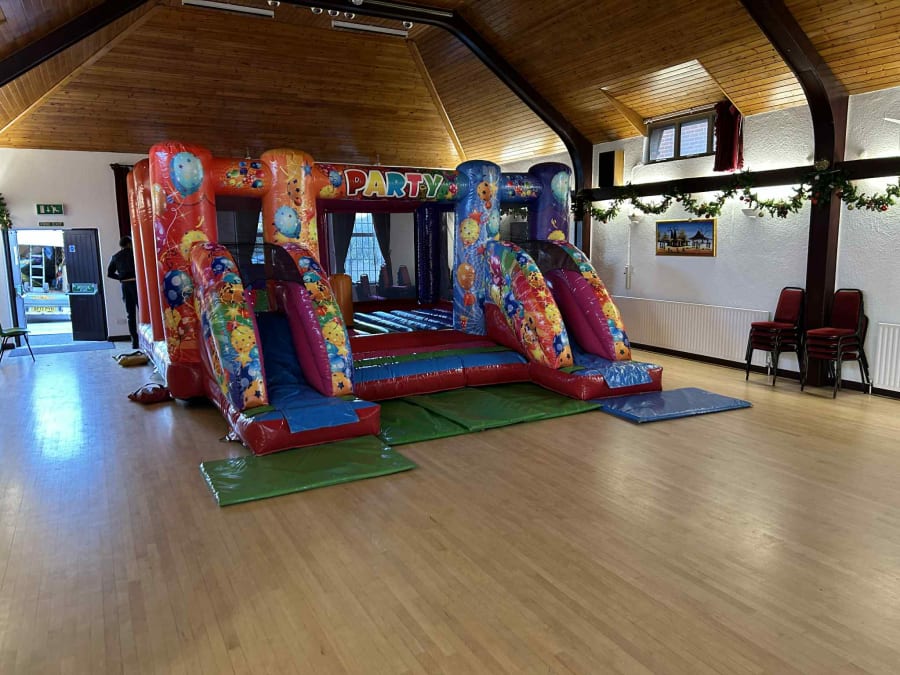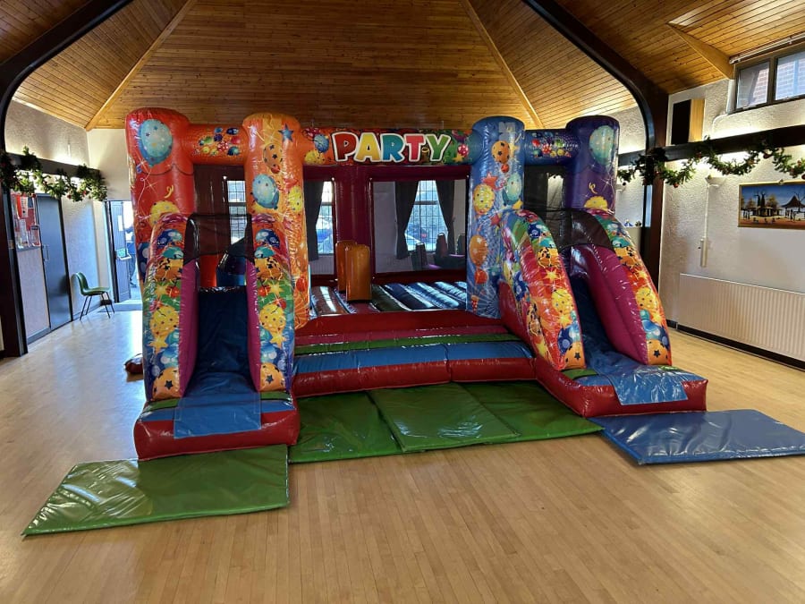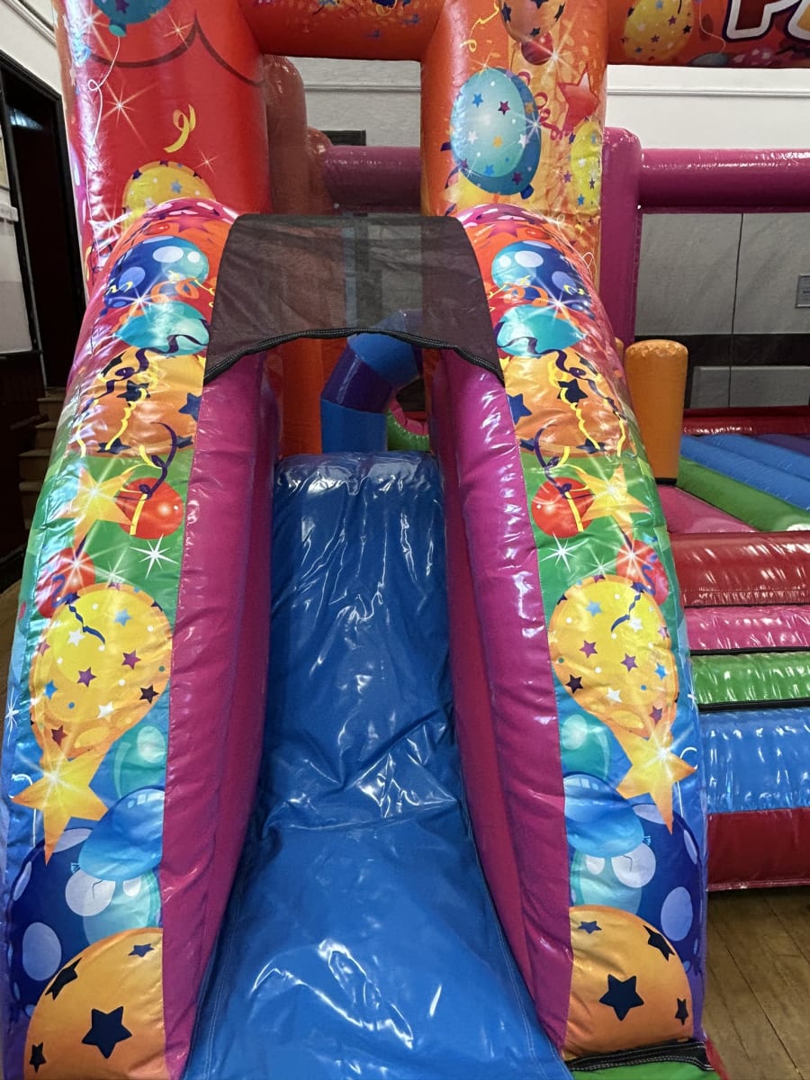 Giant sized (low height) double slide Party Themed Bouncy Castle available to hire in Crayford, Erith, Welling, Sidcup, Blackfen, Belverdere, Barnehurst and all surrounding areas!