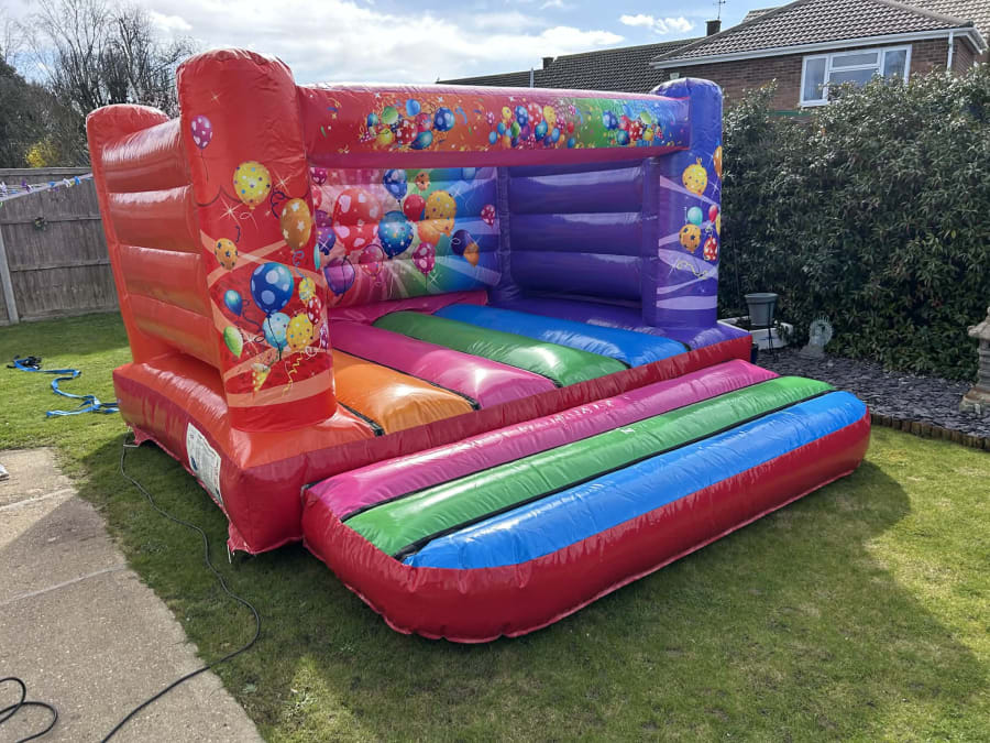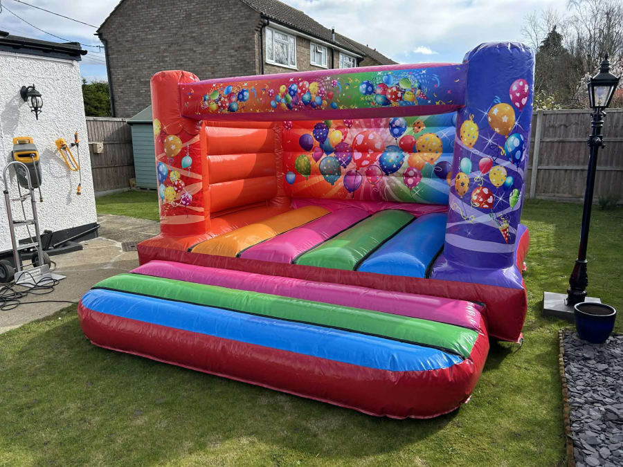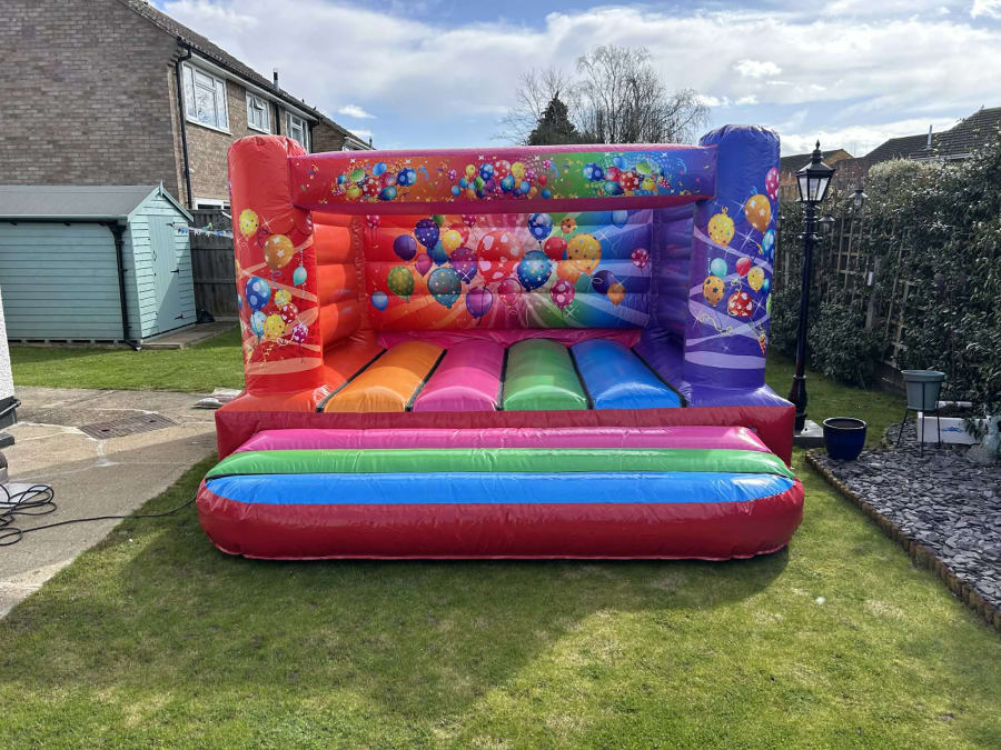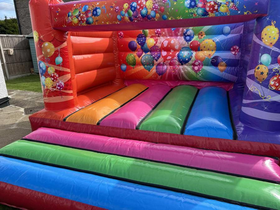 This is a beautiful low-height Party themed bouncy castle, perfect for indoor hires in halls or warm sunny days outside!