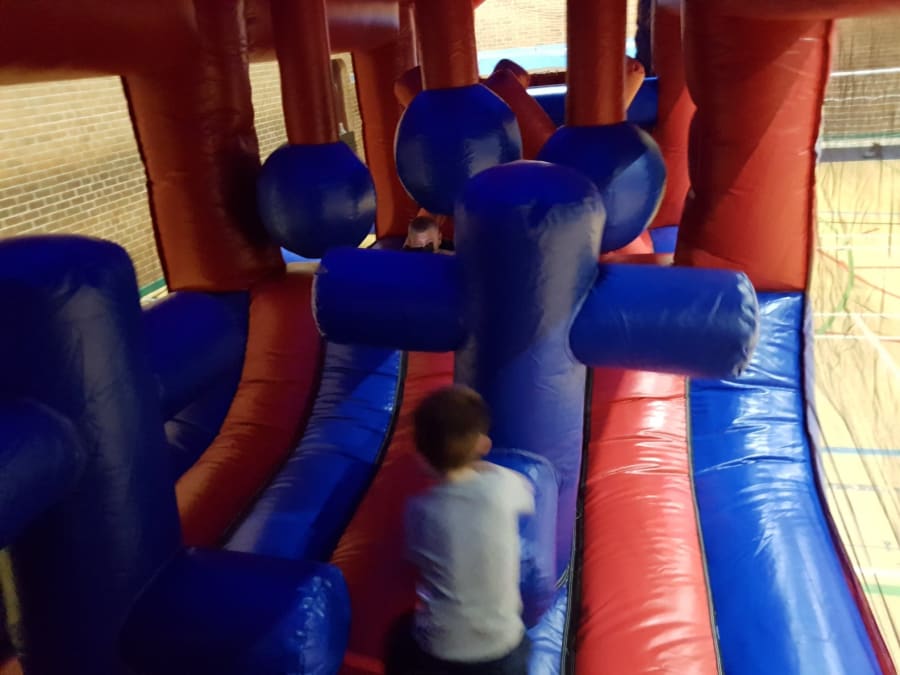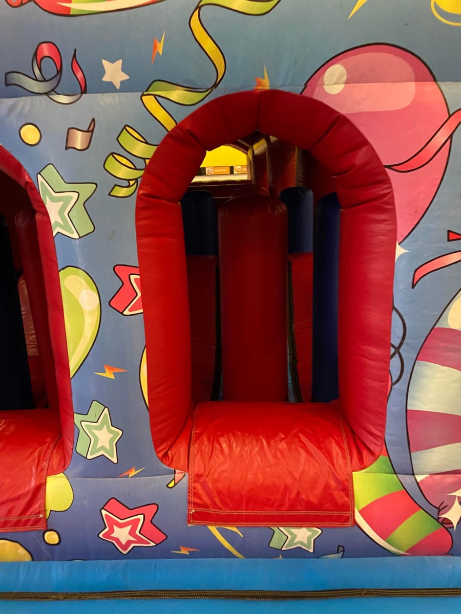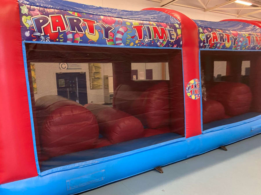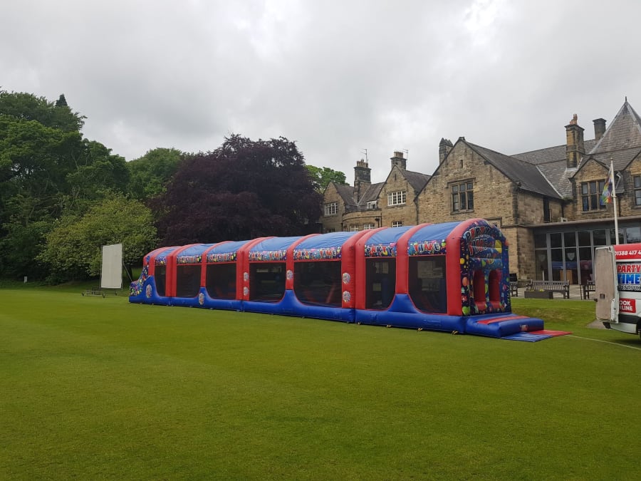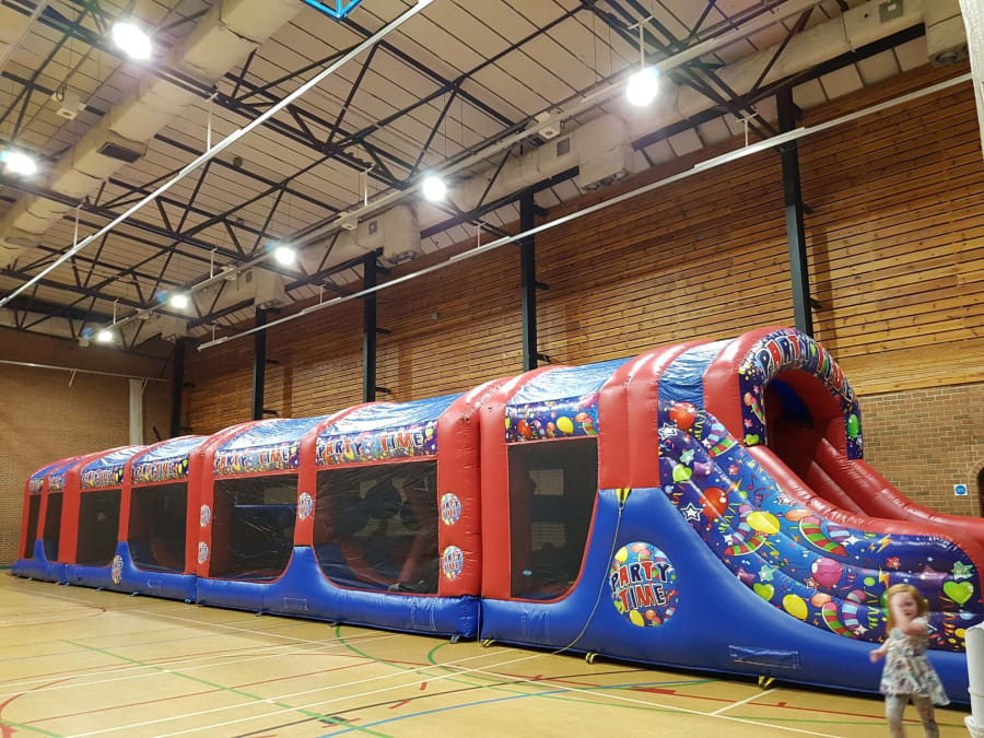 It's entire length is actually made up of four separate sections that we professionaly join once erected to create one long seamless fun-run. It contains lots of interesting and different types of obstacles to over-come, ranging from bish-bash to slippy bumps and cross-mangles, climbing steps and finally slide at the end; Think Ninja Warrior, but for children and adults who just want some bouncy fun!