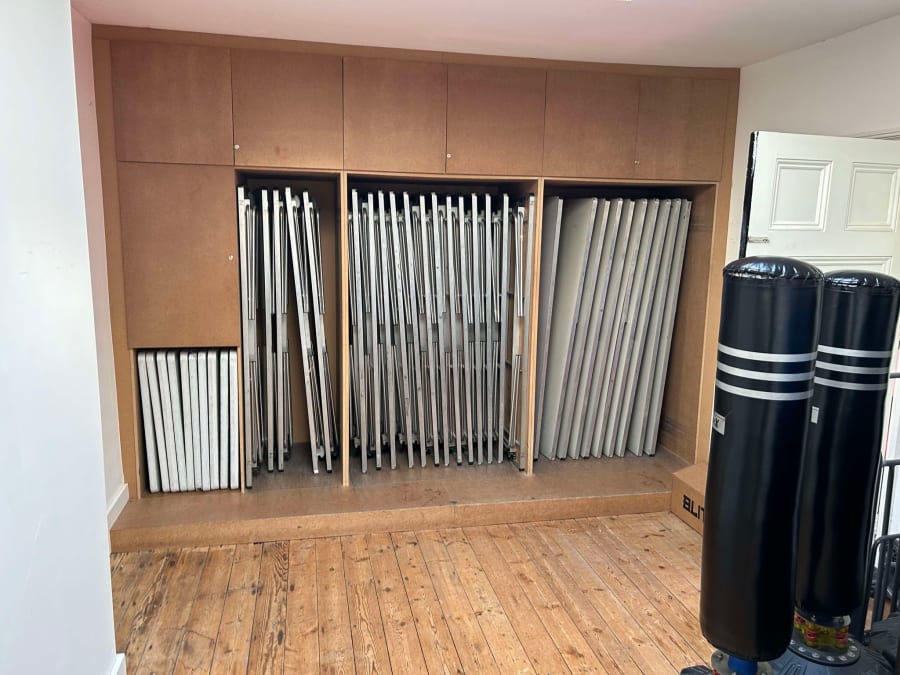 Tables and chairs - These are in a rack in the storeroom adjoining the main hall. There are 30 aluminium Formica top tables (circa 6 ft x 2 ft) that fold neatly. In addition, there are several regular tables, and 80 chairs.