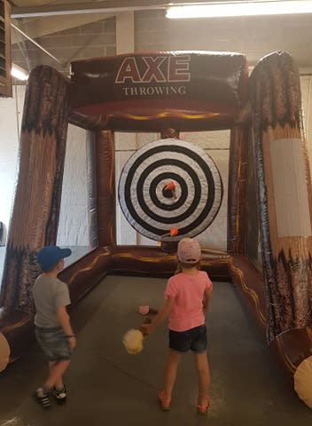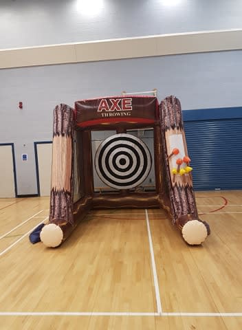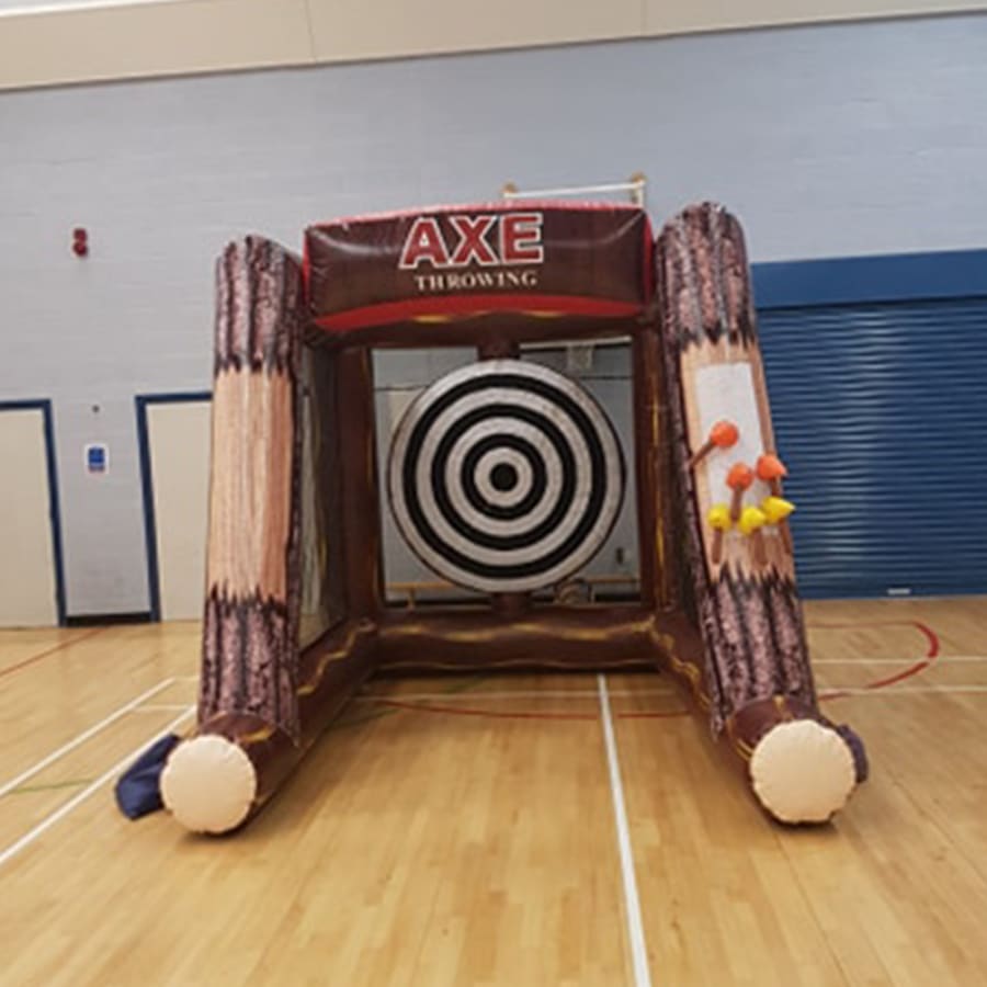 We provide the axes which have velcro sewn on them so they stick, it's a simple game where you throw the axes and try to either beat your competitor with the most accurate shot, or play against yourself for a personal best! It's a sure win with children (and adults), a completely unique type of game and very appealing inflatable that no one will have ever seen anything like before!