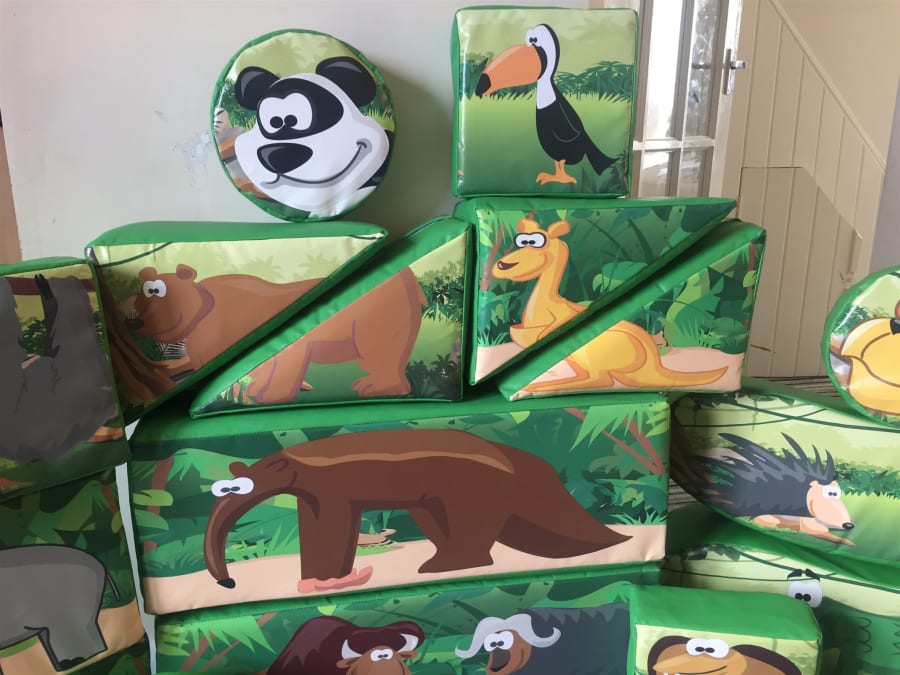 This is our deluxe Jungle soft play set. It's a 16 piece set full of different Jungle animals and shapes, including jelly bean rockers! It comes with a very large matching green tile matted area that can be fitted to virtually any shape or space!