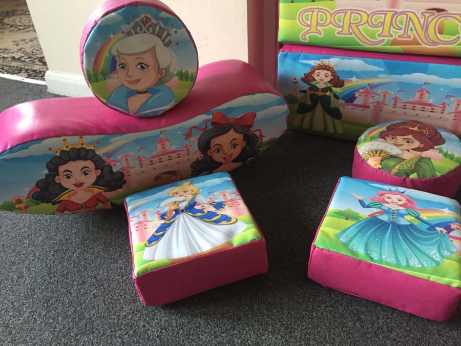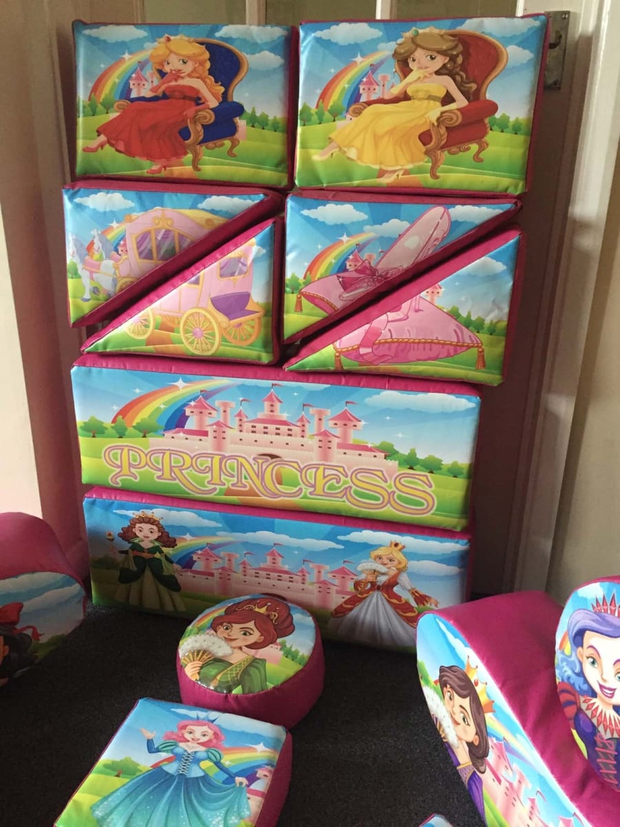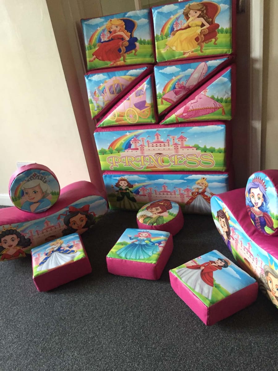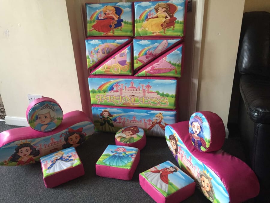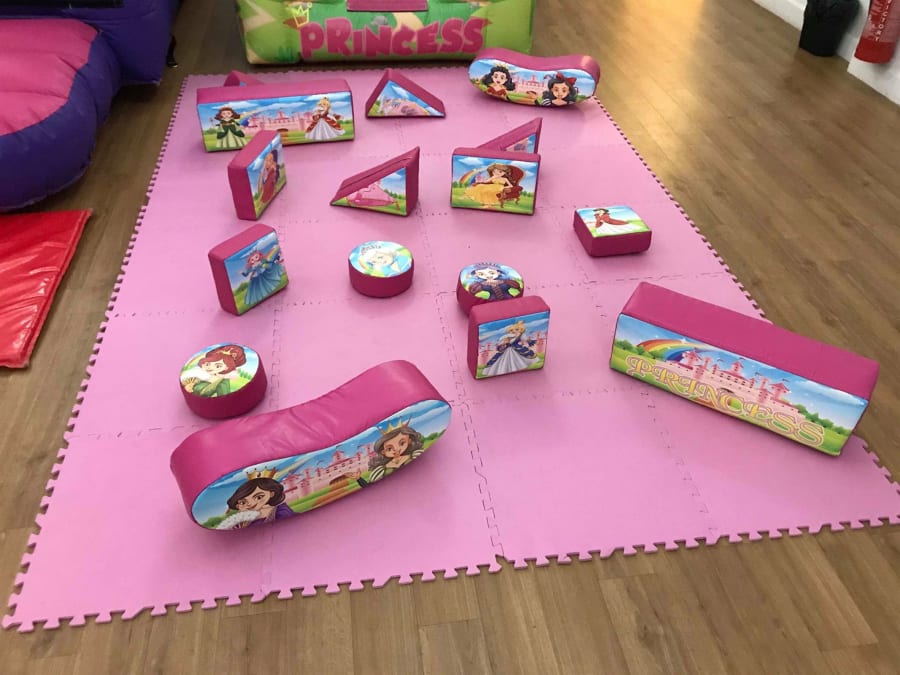 This is our deluxe Princess soft play set. It's a 16 piece set full of different Princesses, castles, carriages and shapes, including jelly bean rockers! It comes with a very large matching green tile matted area that can be fitted to virtually any shape or space!