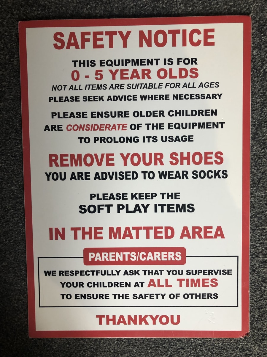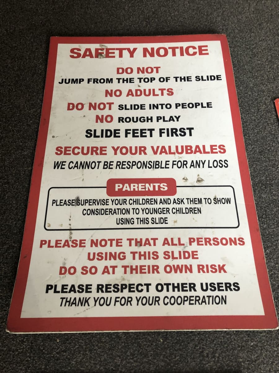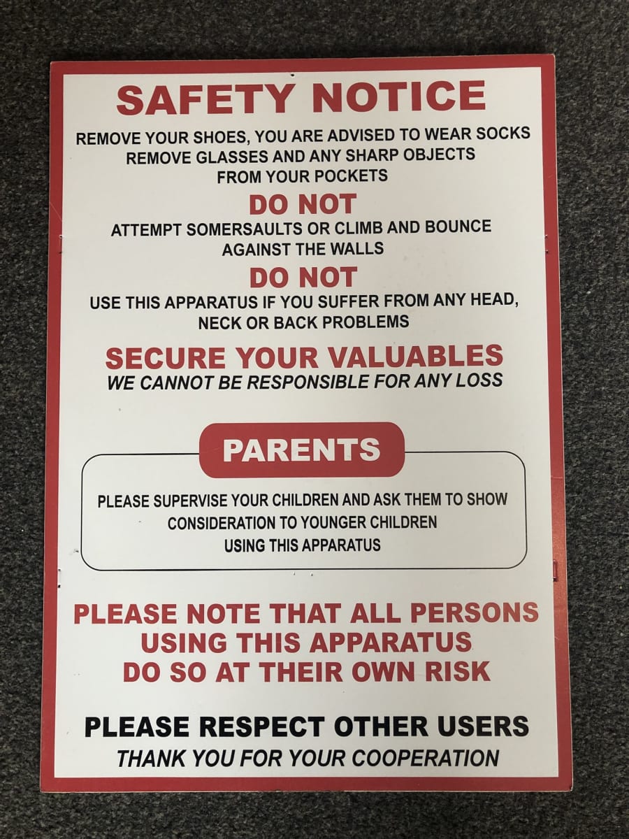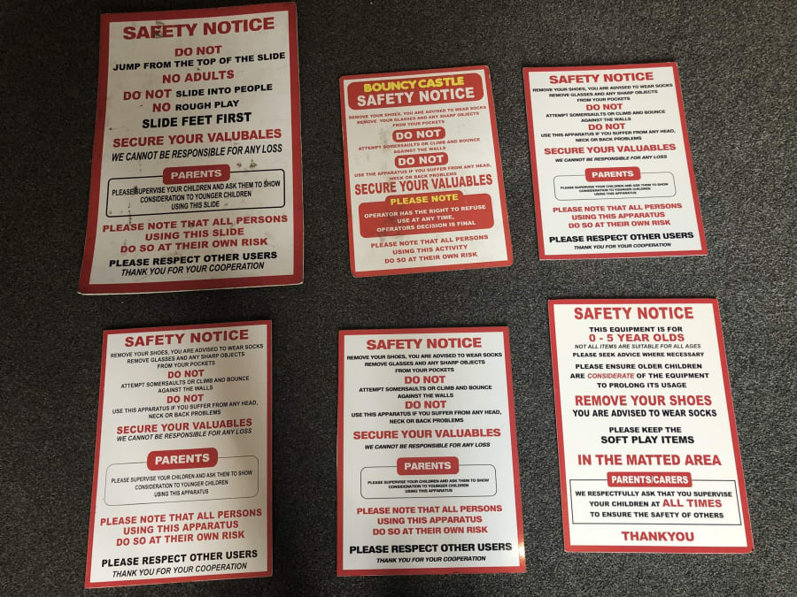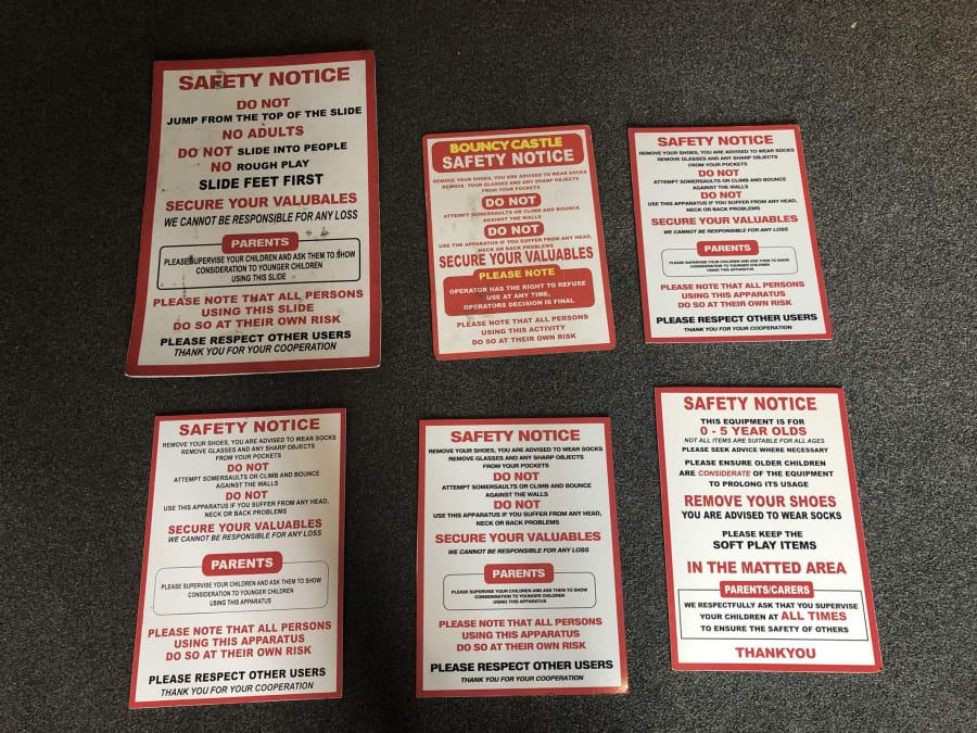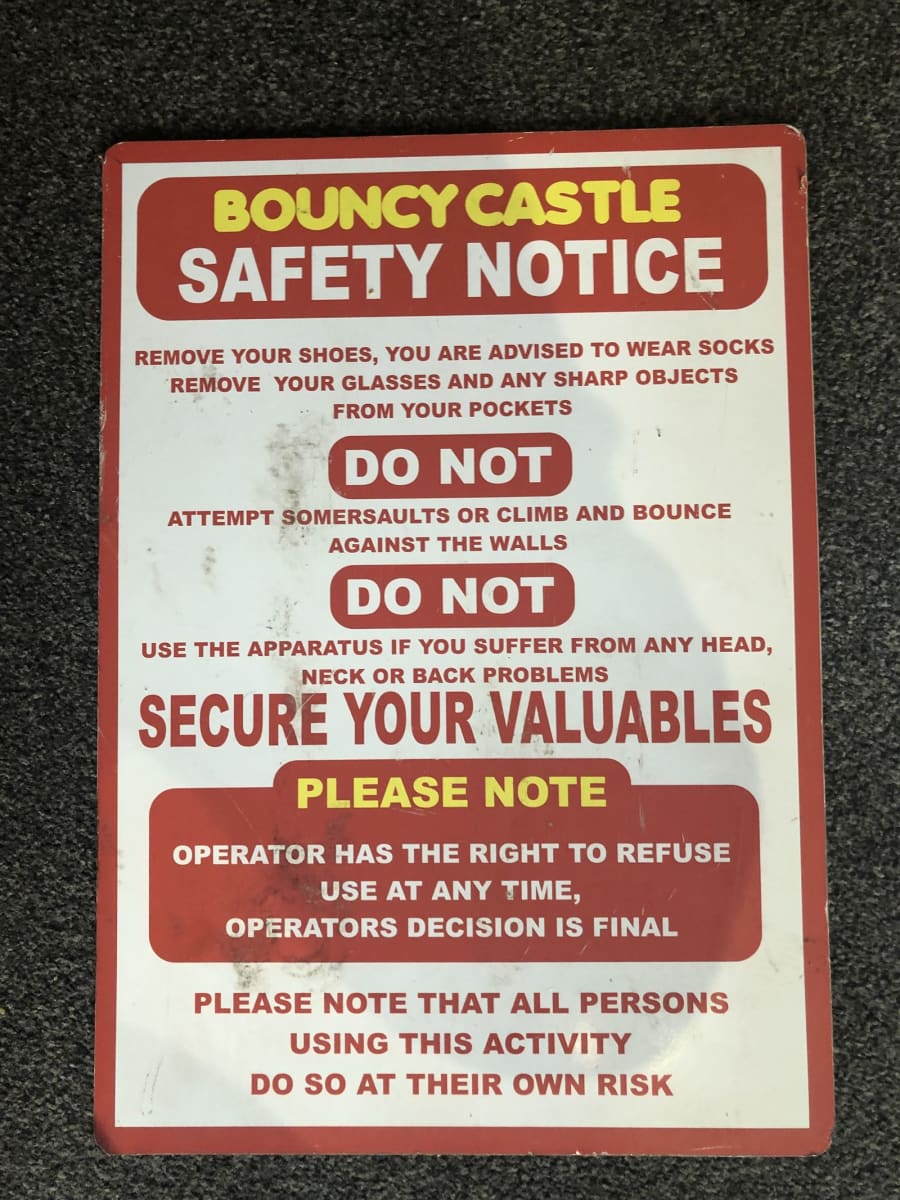 When you book a package for a school fete or any other type of event where you are expecting members of the public, school children or anyone who isn't friends and family, we are happy to provide you with a range of hard-backed safety notices free of charge.These signs clearly state that you use is at customers own risk with other important safety information. The hard-backed metal signs are very clear in their instruction and come in a range specific to certain inflatables; Some are for slides, some are for general inflatables and some are for toddlers in a under 5 area. These can be placed at the entrances with more available to place near inflatables through the field or hall, clearly visible to all throughout the event.