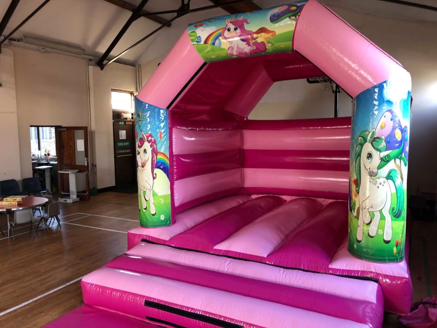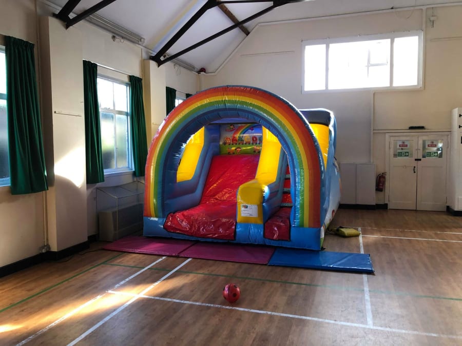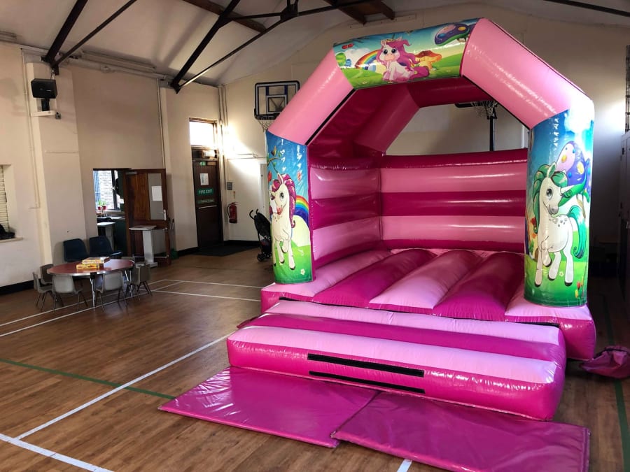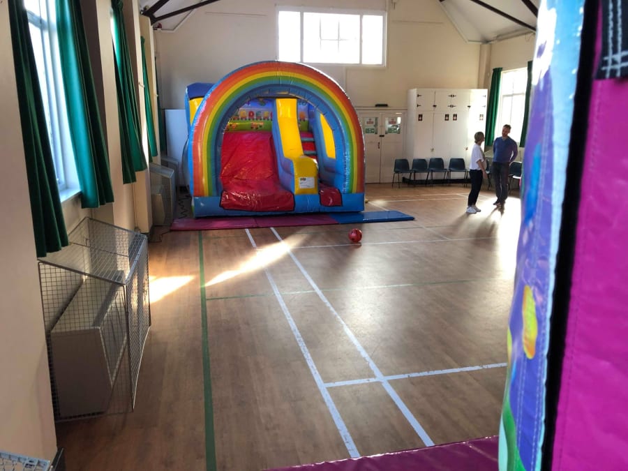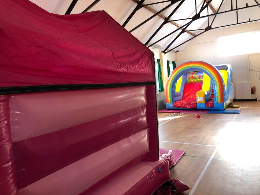 It's a shame we've not managed it before now as it's such a lovely big, clean hall with lots of natural light filling it. It has a lovely reception area with an entrance to the huge kitchen and one to the hall. The hall has lots of open space and it's own kitchen entrance (and serving hatch). There's plenty of space for a bouncy castle (and on this hire we actually had two bouncy castles, a pink unicorn one as well as a junior slide). There's room enough for most of our inflatables to fit in safely, including fun-runs, although the tall slides wouldn't be able to squeeze in height wise.