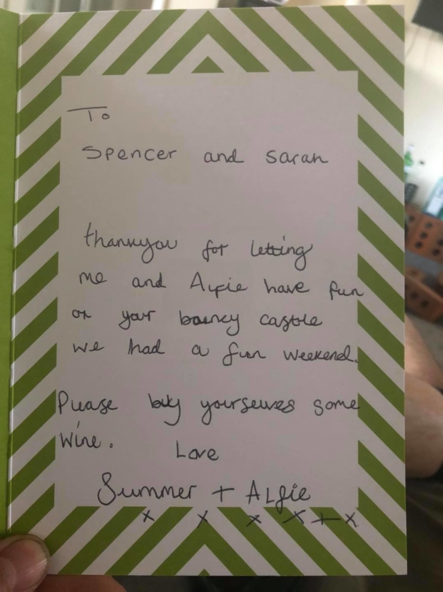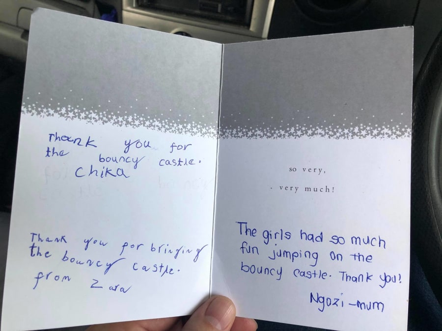 We ensured a contact free delivery and collection; just another part of our protecting us and our customers from COVID 19, so it as even more heart warming to find a gift of a very appreciated bottle and an incredibly thoughtful thank you card left by the inflatable as we arrived to collect! It was even signed by the girls thanking us, and we have also received other cards on collection with our customer’s thanks. There is only one thank you to be made however, and that is for us to thank YOU for trusting us to serve you under such hard circumstances. We have worked hard to build our reputation, build our policies, uphold our values and to gain your trust. For placing your trust in us – we thank you.