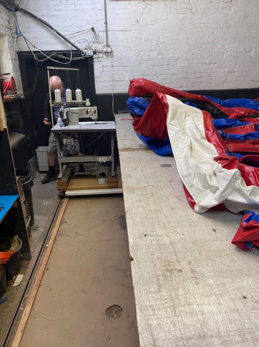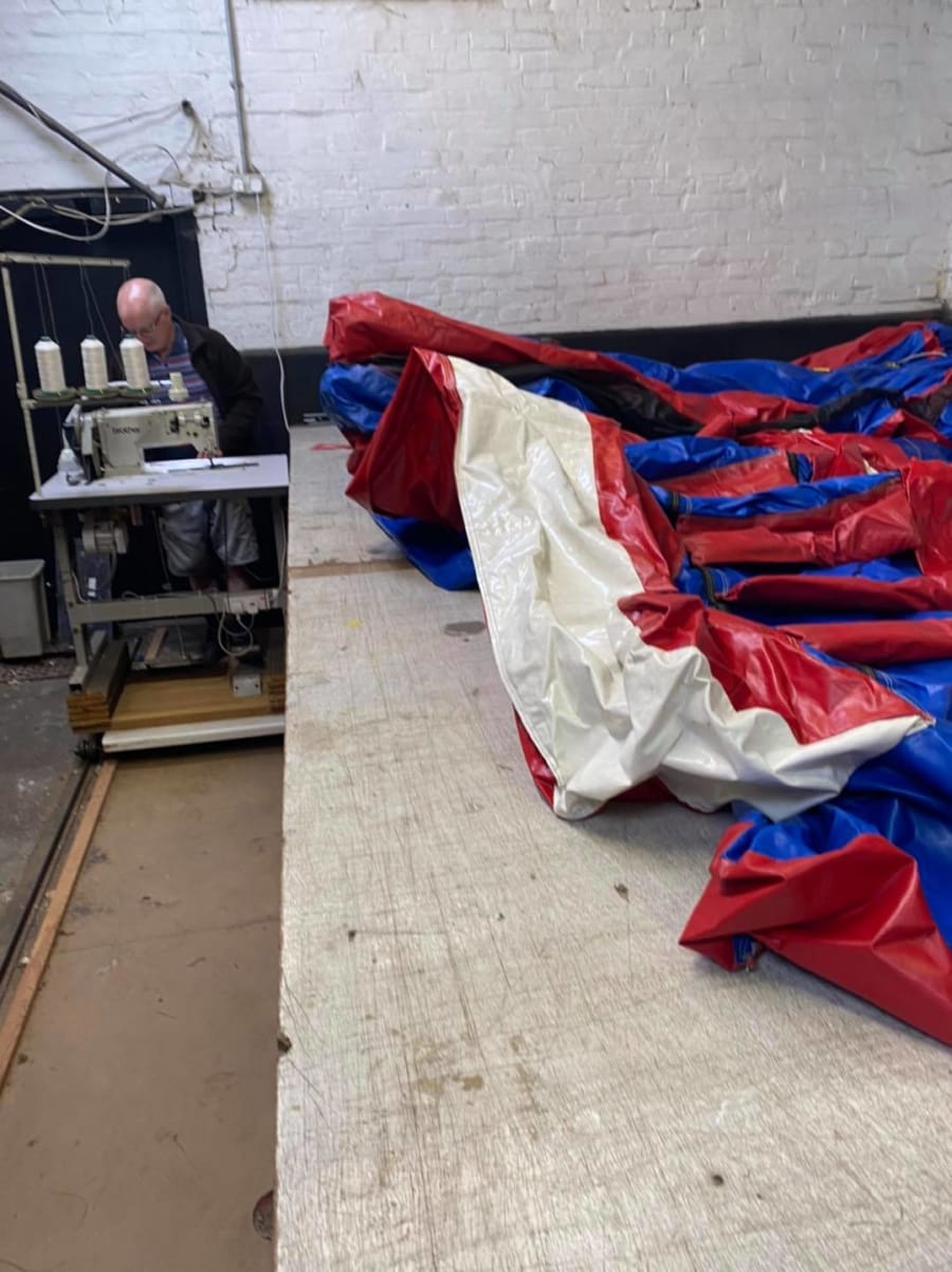 We thought it might be interesting for people to know how much we care about regular maintenance and see a bouncy castle repair work-shop. The actual repair only took 30 minutes, but as you can see in the pictures it has to be rolled out on a large bench. Bouncy castles and inflatables are literally sewn together using a sewing machine; These machines ofcourse aren't the same as you would own domestically, but they work on the same basic principal. The big difference here is that normal machinists will sit stationary and pull and work the material around the needle - Anyone who has seen coronation street will know! For inflatables though, you cannot work such a big piece of equipment through the sewing machine (it's far too heavy and the material too tough), instead the machine has to work around the inflatable - This is achieved by the sewing machine being on wheels fixed to a track and running up and down the bench, with the inflatable being repositioned on the bench to make it accessible!
