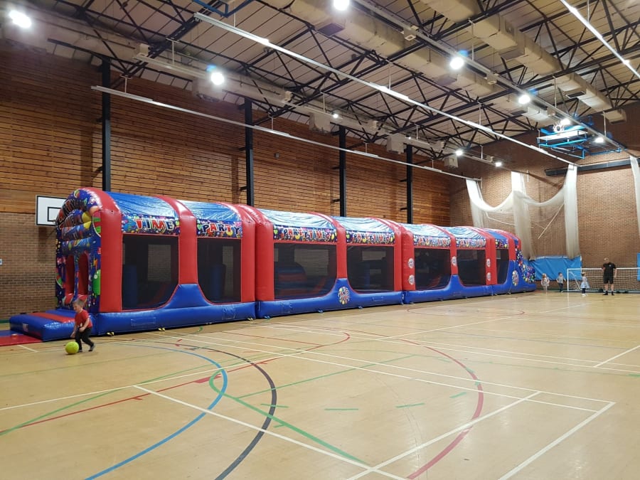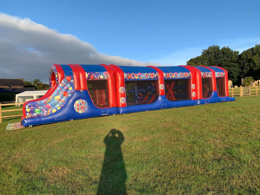 You don't have to hire this as a 100 foot assault course... We have to use the front entrance section and the rear slide exit section as a minimum (you need a place to start and finish!), so at it's absolute smallest it's still a jaw-dropping 40 foot long. The two middle sections are 30 foot long each, which can both be added to make it the eye-watering 100 foot foot in the photo, or just one of them to make it a very impressive 70 foot long - Delivering multiple options to suit the demand.